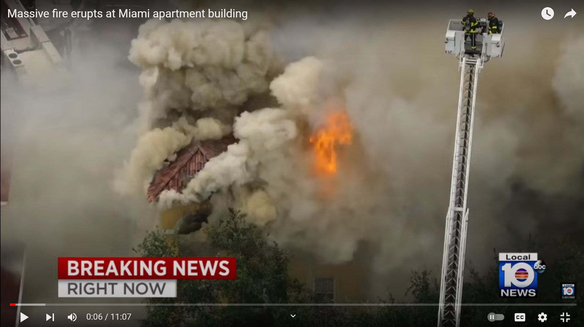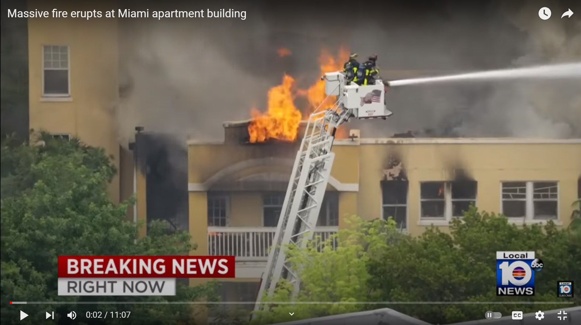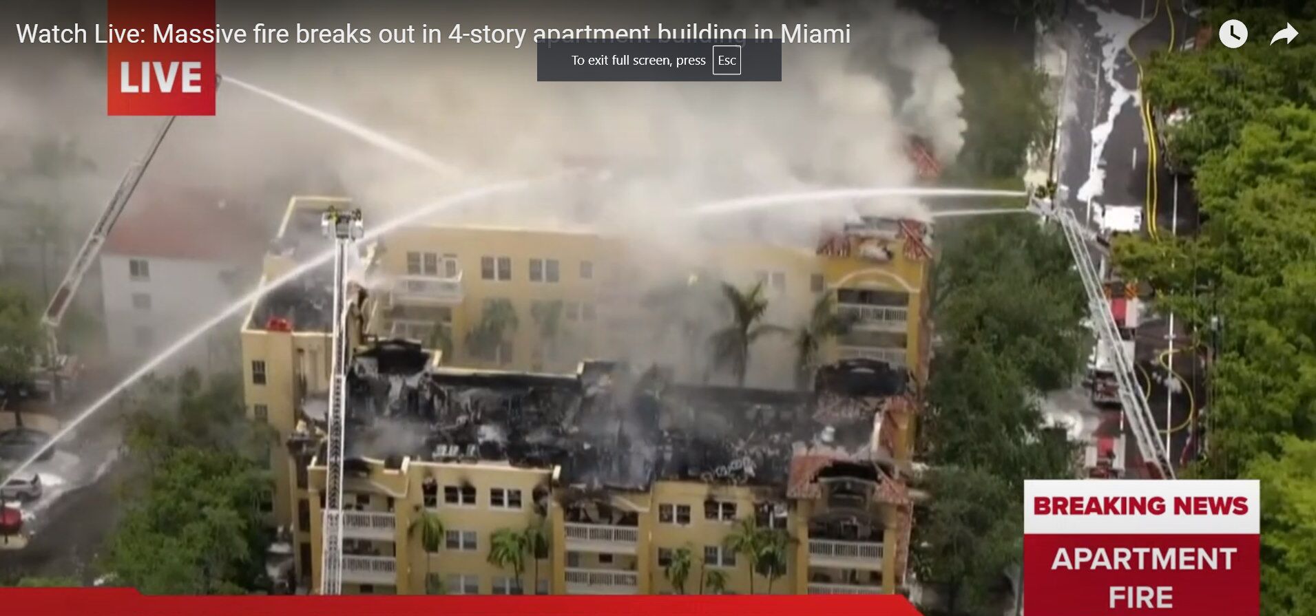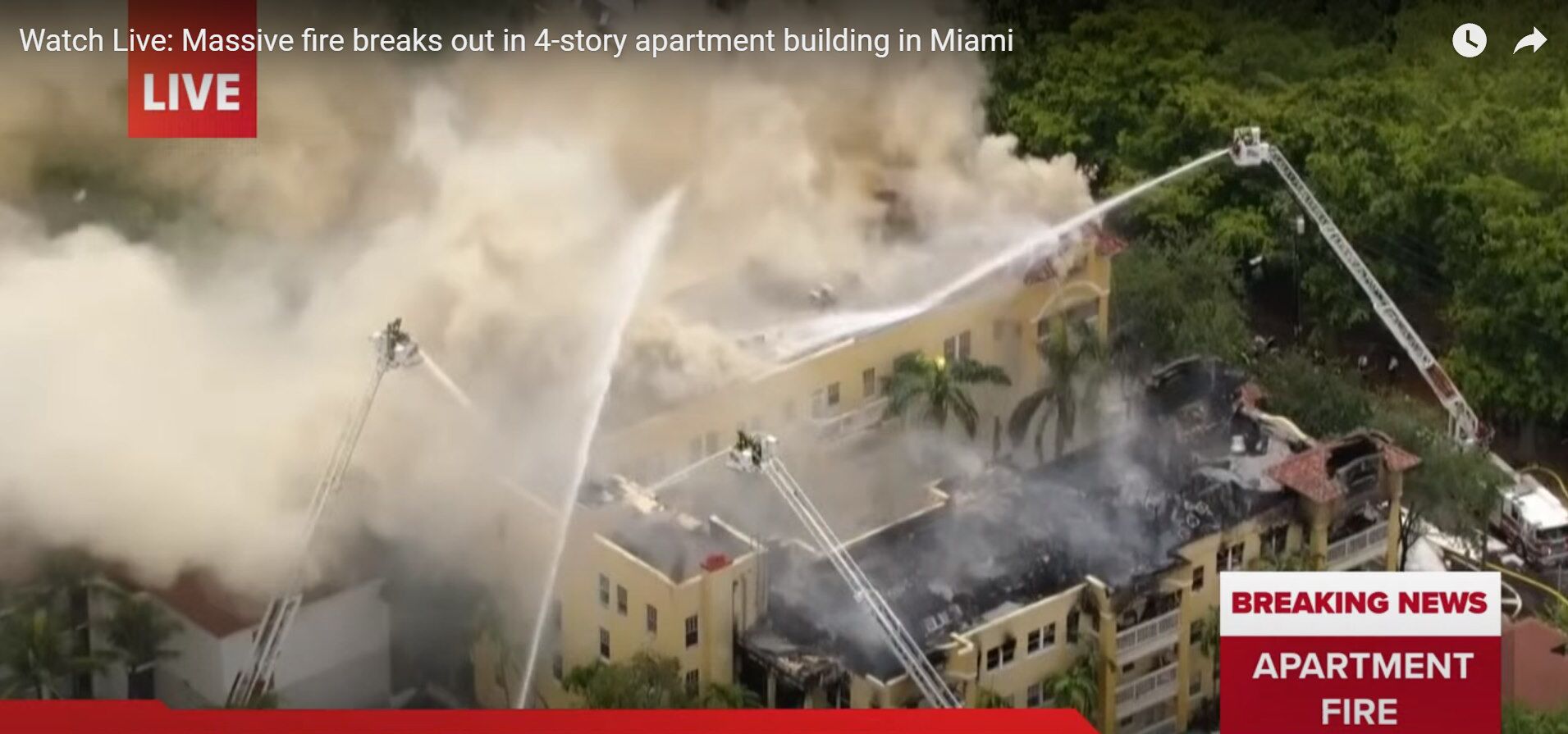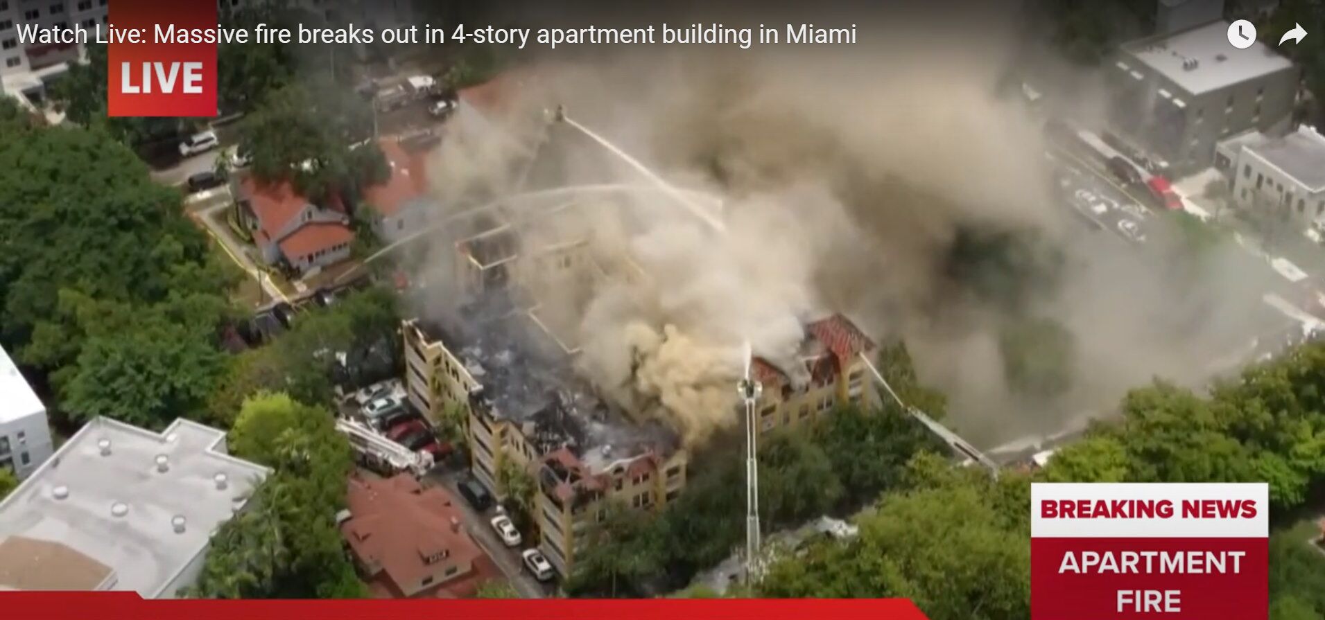 This video shows the firefighters working with 4 or possibly 5 aerial trucks in efforts to put out the flames. Vast amounts of water is being pumped from the nearby Miami River for these aerial pumpers.