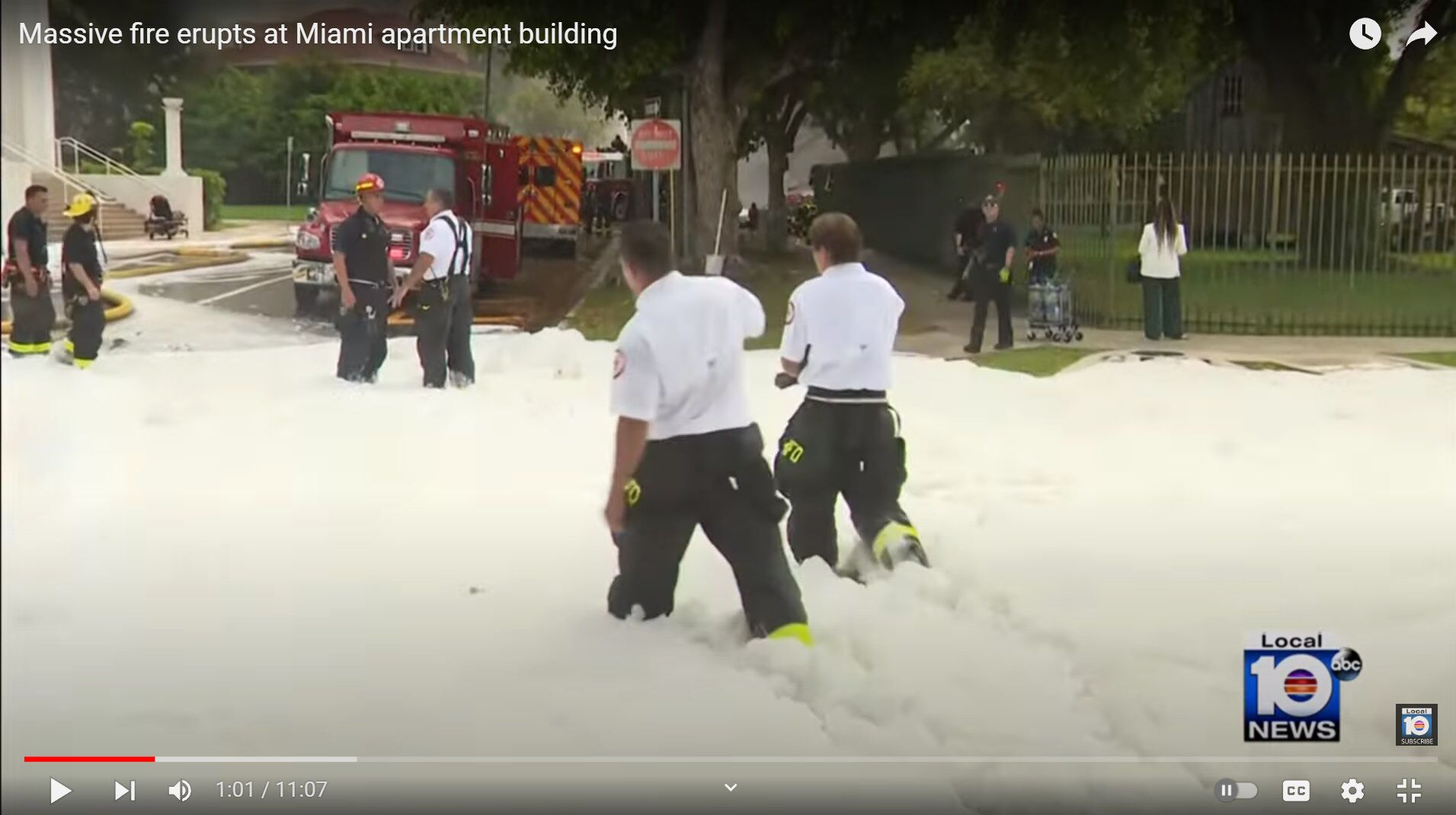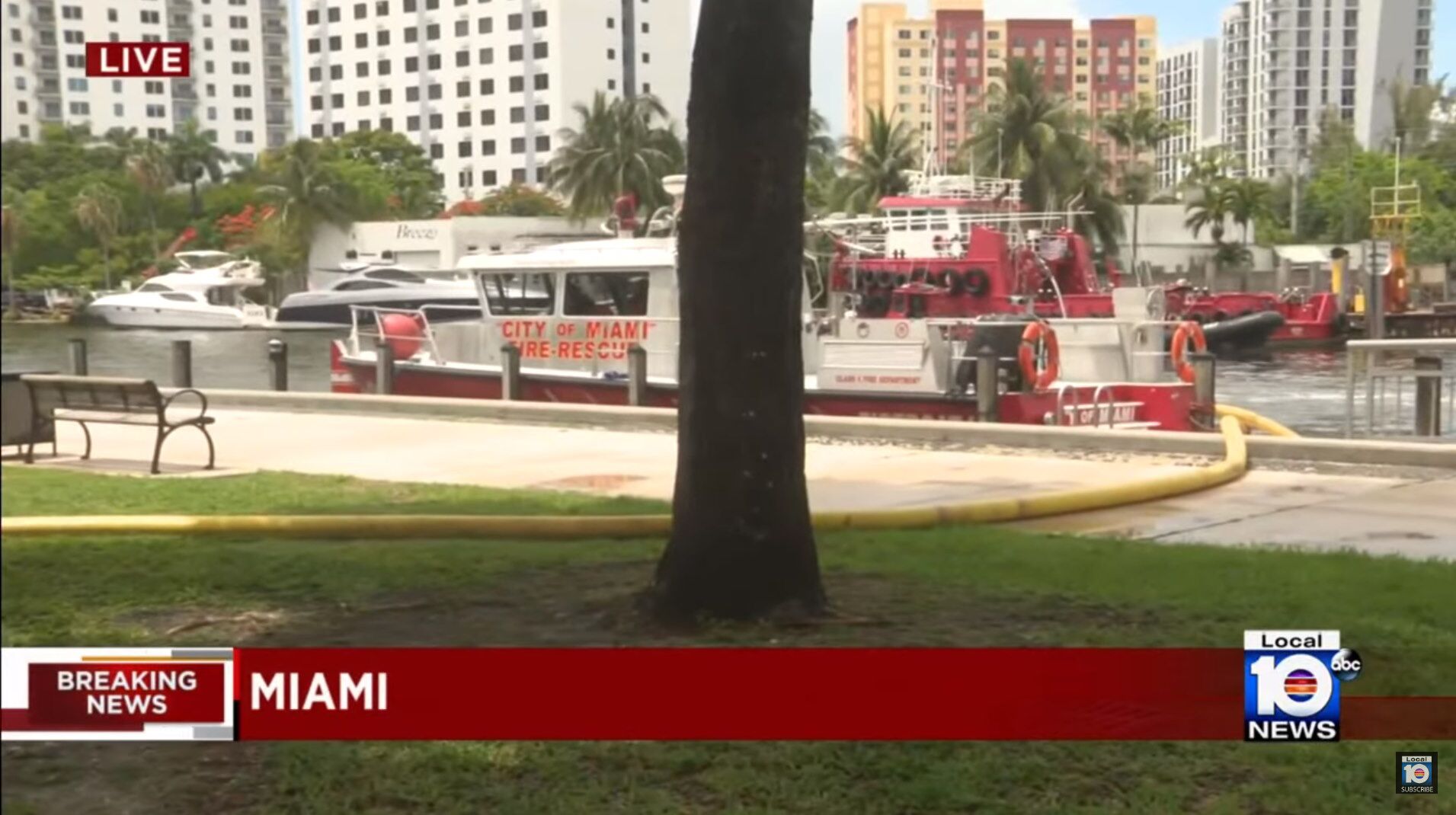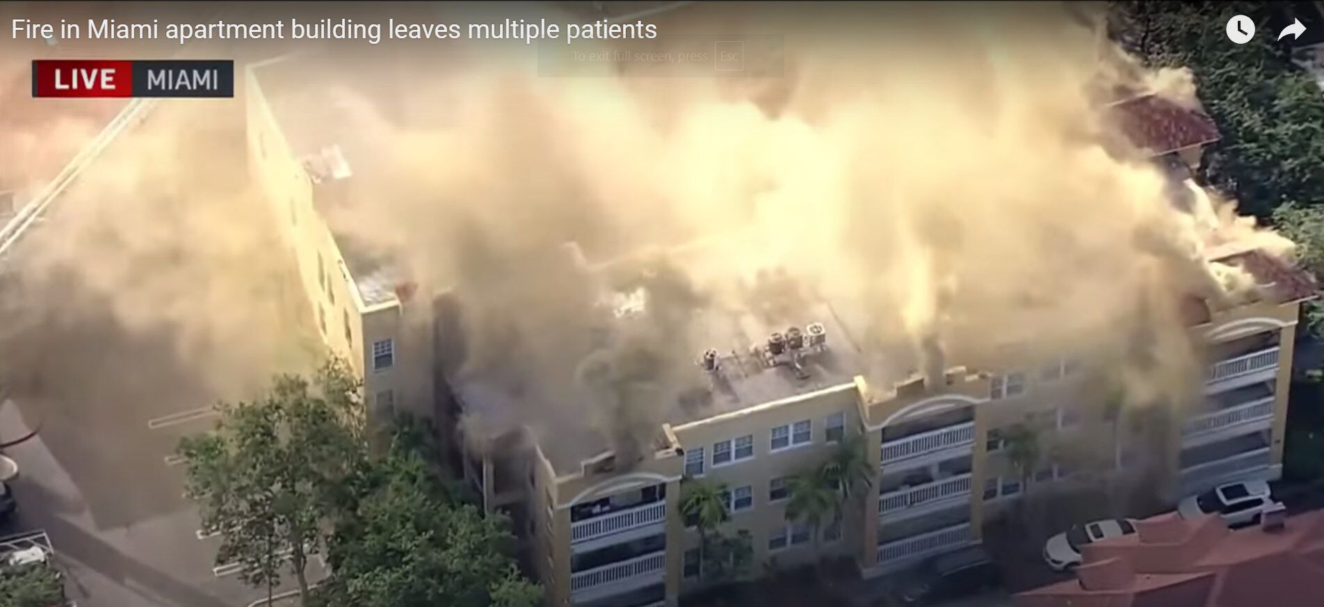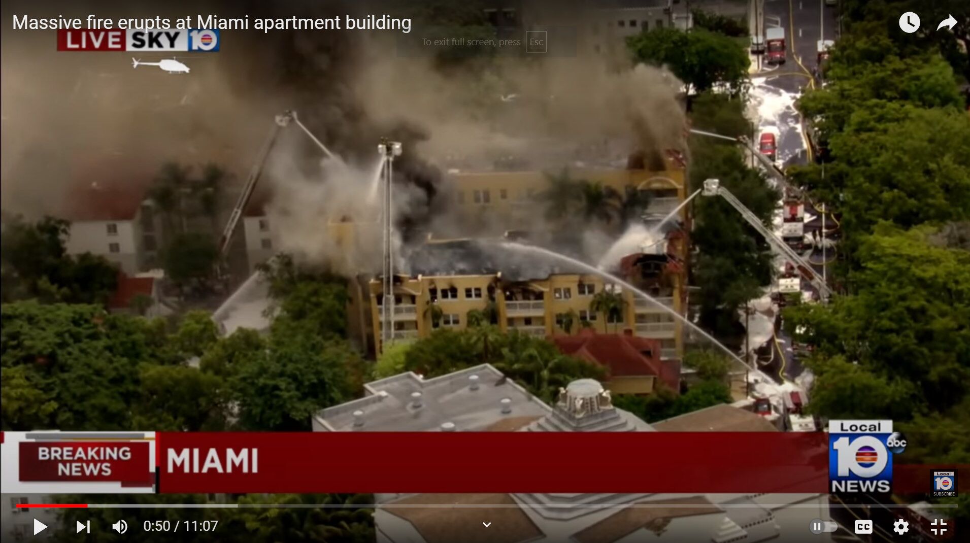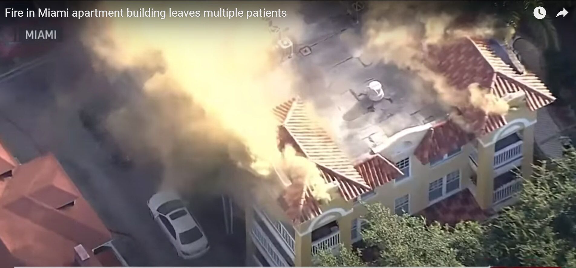 This video shows the firefighters working with 4 or possibly 5 aerial trucks in efforts to put out the flames. Vast amounts of water is being pumped from the nearby Miami River for these aerial pumpers.