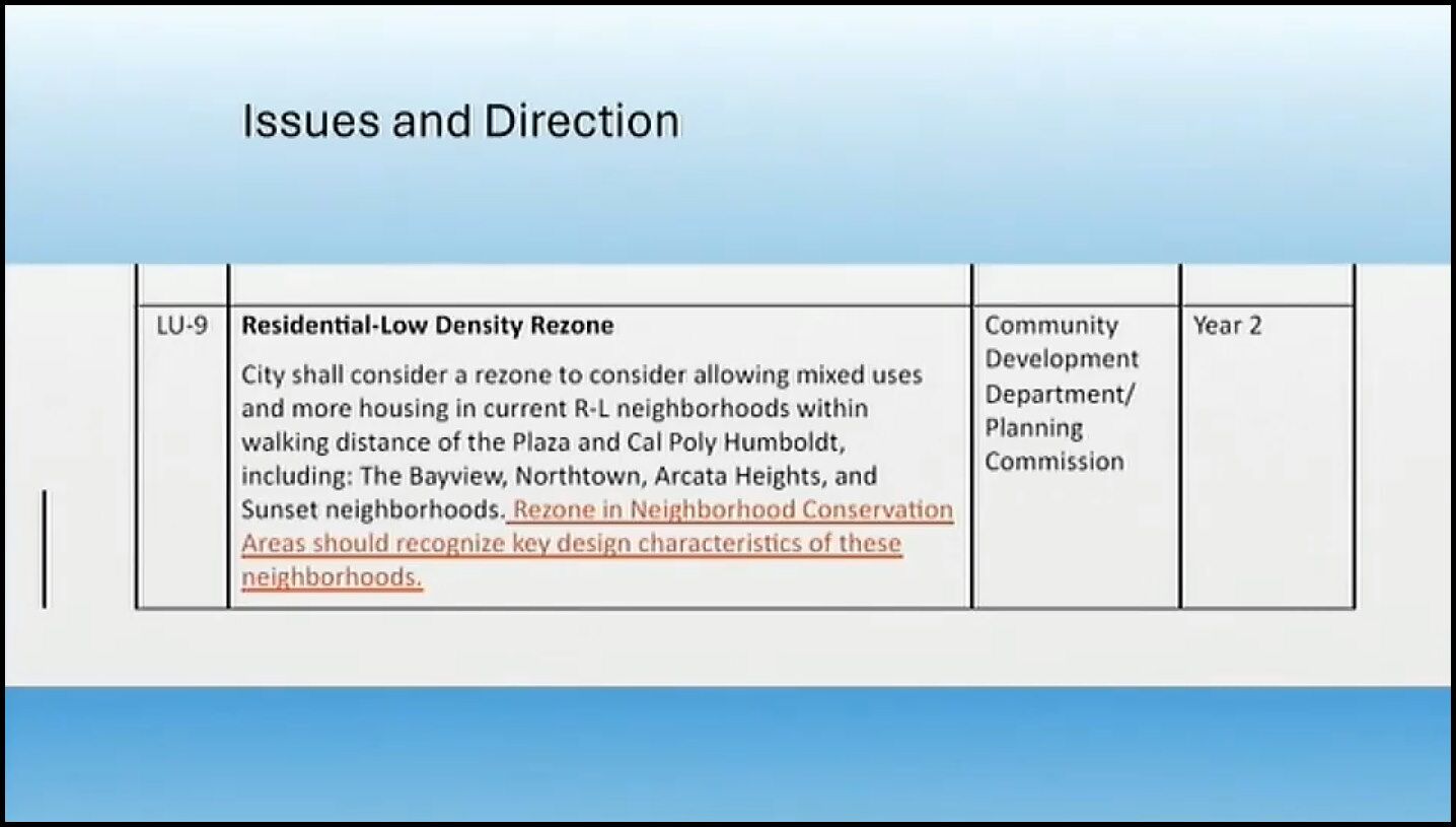 This 12 minute and 11 second video segment on this very important discussion on the Implementation Measure to up-zone some current established Arcata neighborhoods to contain 4-story buildings and “Local-serving commercial uses such as corner grocery stores and coffee shops.”